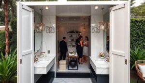 Imagine stepping into a bathroom that feels like a five-star spa, but it’s conveniently parked right outside your tent. Portable